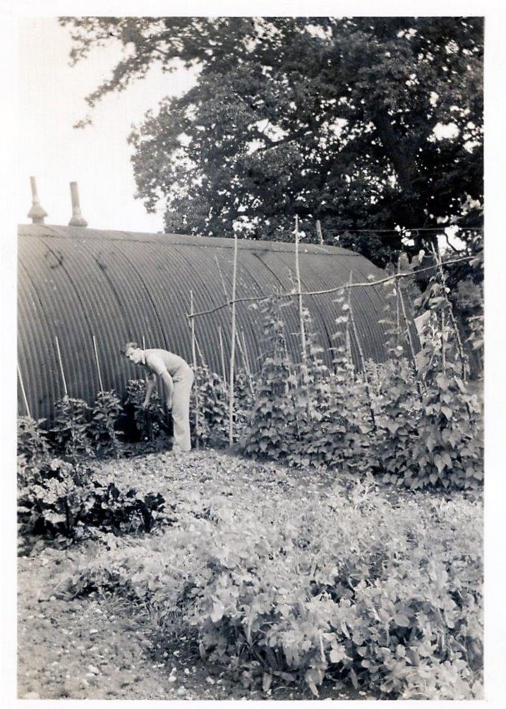 Above is a picture of my father tending their vegetable garden outside their Nissen Hut – the fruits of which they shared with their neighbours. We must remember that after the war and for several years afterwards, things were still rationed, including vegetables.